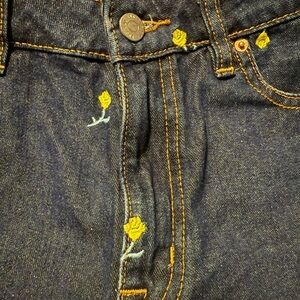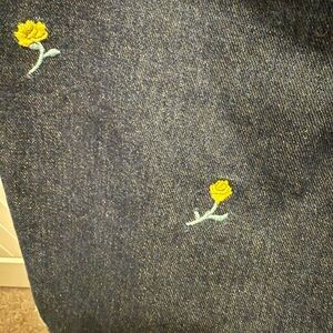 These Urban Outfitters jeans feature a chic ankle-length design in a classic blue hue. The sturdy denim is adorned with a playful embroidered pattern, adding a whimsical touch to the vintage-inspired look. Perfect for a stylish and relaxed day out.