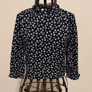 Elegant super sweet black blouse with white floral pattern. Features a high neckline and long sleeves. Ideal for versatile styling.