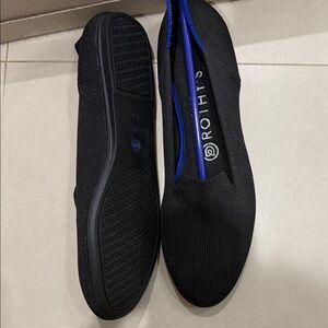 Chic black flats with vibrant blue trim on the back heel. Brand new, never worn. Box and care instructions included. Size 8.5.