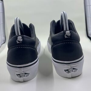 The VANS Karl Lagerfeld x Old Skool Laceless Platform Black sneakers in size 6.5 are a stylish and trendy option for women looking for a casual shoe. With a lace-up closure and low-top design, these athletic sneakers feature a rubber outsole for comfort and durability. The black color, leather upper, and signature VANS Old Skool platform make these sneakers a versatile choice for the summer, fall, and spring seasons. Whether for skateboarding or everyday wear, these sneakers are a fashionable and practical option for any wardrobe.