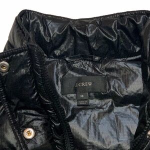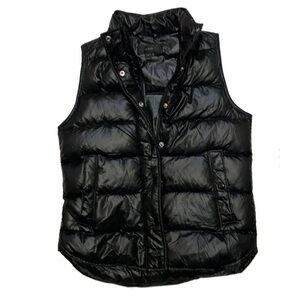 Sleek black puffer vest with shiny finish. Features button details. Ideal for layering.