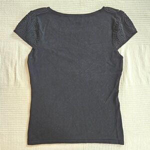 Leo Guy black knit top showcases intricate soutache embroidery along the neckline and cap sleeves, creating a sophisticated textured effect. This elegant piece features a flattering scoop neck and a fitted silhouette, perfect for elevating a casual look or pairing with dressier separates. The knit fabric offers a comfortable stretch, while the decorative swirl patterns add a touch of artistic flair. Note that the interior care tag has been cut.