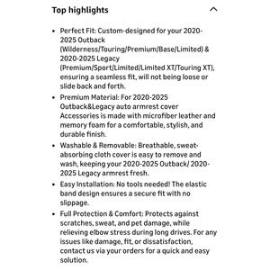 The Armrest Cover Outback & Legacy 2020-2024 2025 is a premium leather center console lid pad designed specifically for the Subaru Outback and Legacy vehicles. It features a sleek black color and is durable for long-lasting use. Easy to install, this armrest cover adds a touch of sophistication to the interior of your vehicle, making it a stylish and practical upgrade for your car. With its specific fitment for the Outback and Legacy models, this cover ensures a perfect fit and enhances the overall look of your vehicle.