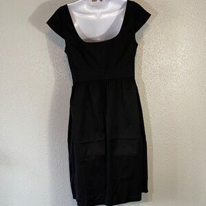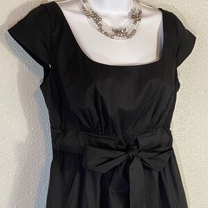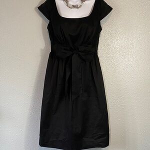 Chic black mini dress with a flattering fit. Features a stylish bow at the waist, cap sleeves and pockets! Perfect for any occasion. Size 12. Pit to pit 17”. Shoulder to hem 38”.