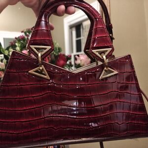 Incredible croc bag by Mac Duggal. Removable crossbody strap. Bronze metal hardware is nice and weighted. Impeccable cream colored interior. Magnetic closure. Could go with denim or formal. I purchased it and never used it. It's a really gorgeous bag. Flawless. Thank you.