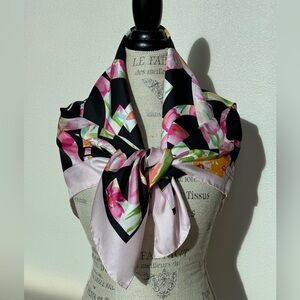 Chic silk scarf with vibrant floral design. Perfect for adding elegance to any outfit.