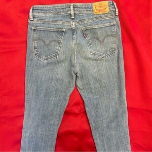 Trendy Levi's skinny jeans with a light blue wash. Features stylish distressed details. Ideal for casual wear. Stretch