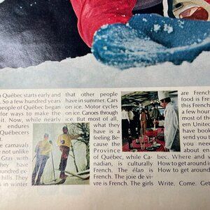 This is a 1970 vintage print ad promoting winter tourism in Quebec. It features vibrant images of activities, cuisine, and French culture, with information to request more tourism details.
