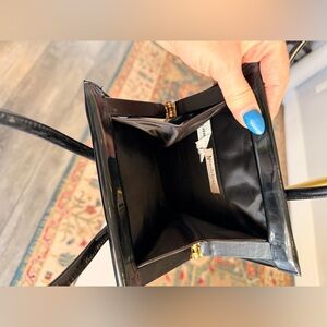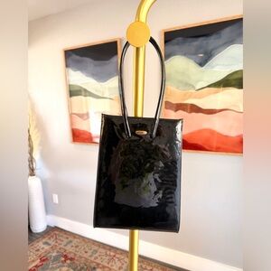 vintage black patent bag, 1960s handbag, Lenox bag, Neusteters Denver, vintage purse, patent leather handbag, structured vintage bag, mod handbag, retro purse, hinged top bag, vertical clutch, classic black handbag, collectible vintage bag, evening bag, chic vintage accessory, fashion history piece