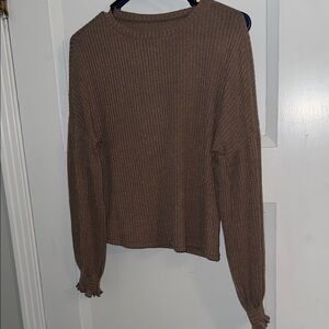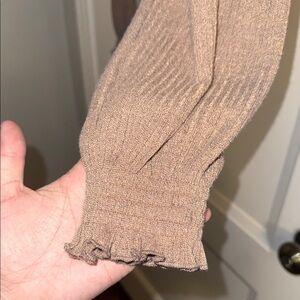 Cozy ribbed knit design. Long sleeves with ruffle cuffs. Perfect for casual wear.