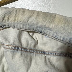 Casual off-white denim jacket. Features button closure and chest pockets. Ideal for layering.