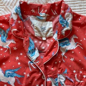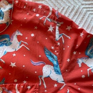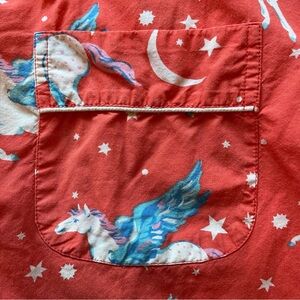 Printfresh Moon Flight Pegasus Long Pajama Set. Button up long sleeve top. Pull on bottoms with drawstring. Hip pockets. Tiny pinholes near left front shoulder (see last two photos).