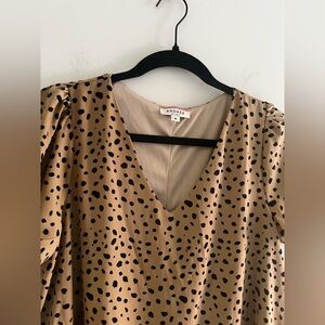 Neutral tan/camel base with black speckled print. Flowy shift silhouette with flattering V-neck and soft puff sleeves. Fully lined and lightweight.