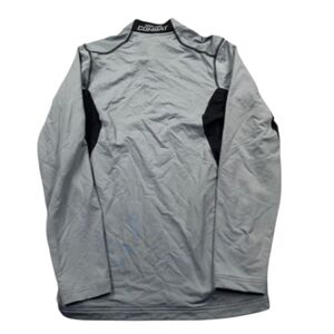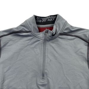 Nike Pro Combat fitted top, ideal for athletic activities and layering. Features a gray base with black accents on the sides and shoulders, with Hyperwarm and Dri-FIT MAX technology implemented into the build. Additional details include a quarter-zip closure for adjustable ventilation and the Nike Pro Combat logo displayed on the left hem. The collar lining is red.