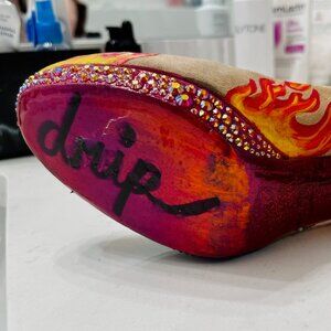 Ignite your style with these stunning custom Kate Spade heels where timeless luxury meets fiery artistry. The rich tan suede foundation provides a warm, sophisticated canvas that lets the Drip Creations transformation take center stage—classic material reimagined with bold, breathtaking detail.