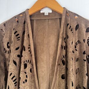 Erin London Brown Suede Cut Out Floral Open Front Waterfall Boho Cardigan Size MD