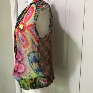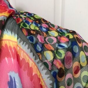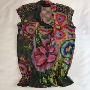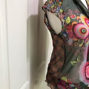 Bold, artsy, and very Desigual. This colorful semi-sheer floral blouse features an adjustable tie V-neck and cap sleeves with an easy Y2K / festival vibe. Layer it over a cami or bralette and style with denim, a mini skirt, or wide-leg pants for a statement “art-to-wear” look.