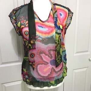 Desigual Sheer Floral Tie V-Neck Blouse S Y2K Cap Sleeve Art Print