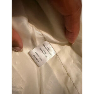 This is a white moto jacket by superdown, size S, featuring an asymmetrical black zipper closure and black zippered pockets. The jacket has a notched lapel collar with black snap details and shoulder epaulets. The shell is 100% polyurethane, and the lining is 100% polyester. The back of the jacket is plain with subtle seam detailing. NWOT but belt is missing!