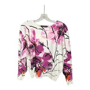 Stylish Joseph A sweater with abstract floral patterns. Features purple and pink hues with black outlines on a white base