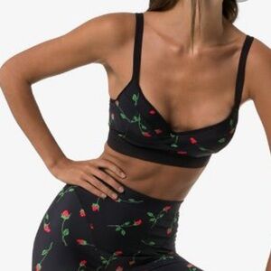Stylish black sports bra with a vibrant floral design, perfect for comfort and support.