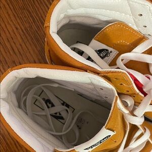 Vans high-top sneakers. Mustard color with white details. Perfect for casual wear.