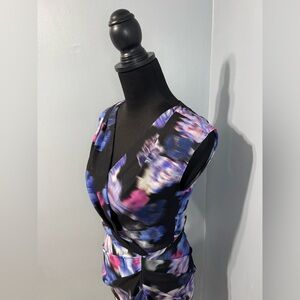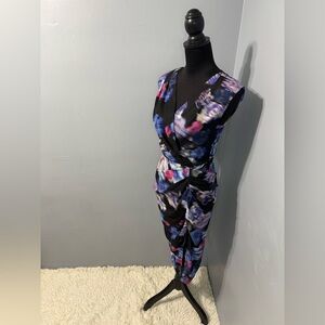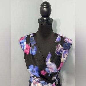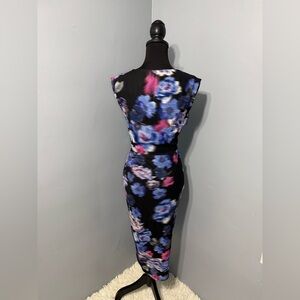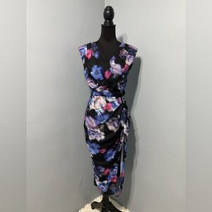 Roma dress is elegantly draped to flatter your figure and curves. A blurry floral print and leg-baring slit complete this dress with a modern flair.