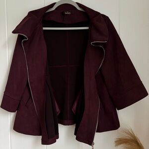 Elegant trench coat with a rich burgundy color. Features a sleek design and zip closure. Ideal for versatile styling.