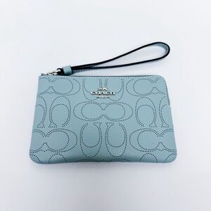 Coach Perforated Leather Signature Corner Zip pouch. Light blue with silver hardware. Official color names are silver and seafoam.