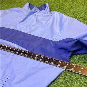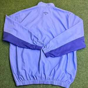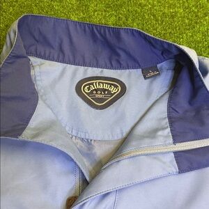 Style: Callaway Sport Vintage Two-Tone Blue Quarter-Zip Weather Resistant Windbreaker / Callaway logo on back below collar / Two pockets on front