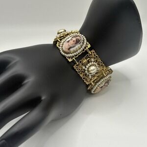 Vintage Victorian Painted Lady Faux Pearl Ornate Link Bracelet