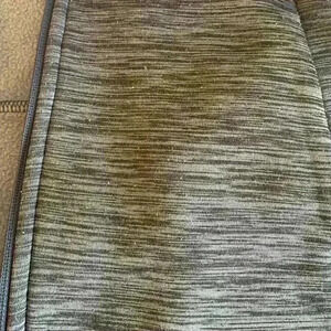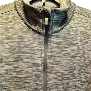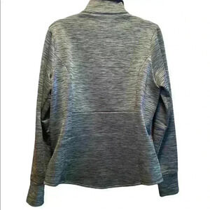 TekGear fleece lined Jacket. Zipper front with slit pockets at hips. Thumb holes at cuff. Some pilling. 94% polyester 6% spandex. Color: Grey. Size: Large. Measurements laying flat: Armpit to Armpit 20.5”. Shoulder to hem 25.5”. Pet free smoke free environment.