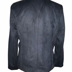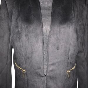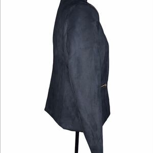 Black faux leather blazer. One hook closure. Long sleeve. Side pockets with zip closure. Fully lined. 90% polyester/10% spandex. Lining: 100% polyester. Size: medium. Original price: $118.00. NWT.