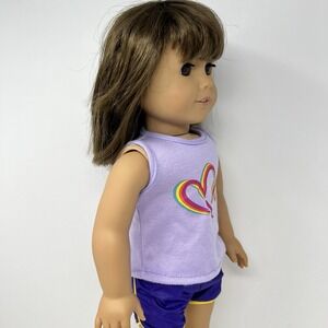 This beautiful Pleasant Company 2008 Samantha Parkington 18 inch doll from American Girl is a timeless historical favorite and a treasured addition to any collection. Samantha is a retired character known for her classic Victorian inspired story and elegant features. She has been redressed in a purple shirt, shorts, and black sneakers, giving her a fun updated look. Please note her hair appears to have been V cut shorter than its original factory length. With her expressive brown sleep eyes and classic design, this doll remains highly desirable among collectors and doll enthusiasts alike. A wonderful opportunity to own a retired American Girl historical doll at a great value.