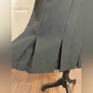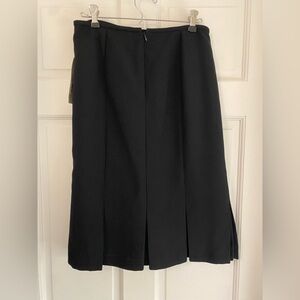 Black skirt with classic design. Lined. Pleats on bottom. Zip and clasp back closure. Some tape reside on the inside (see pics) where the pleats were taped closed - may come out in the wash, but it is on the inside and not visible. A black skirt is a must-have addition to any wardrobe!