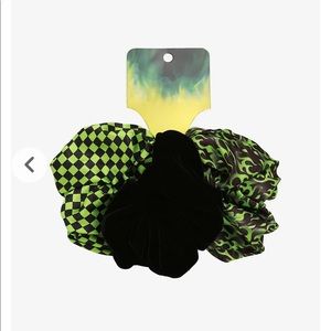 You won't have a bad hair day with this green and black scrunchie set! The two silky scrunchies are printed with green and black flames on one and green and black check on the other. A complimentary black velvet scrunchie completes the set.