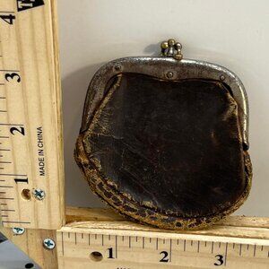 Authentic antique leather coin purse featuring a classic metal kiss lock clasp frame and compact change pouch design. This piece shows significant age and wear including heavy interior deterioration, leather cracking, surface wear, and patina on the metal frame consistent with early vintage construction.