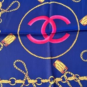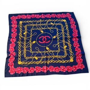 Luxurious silk scarf by CHANEL. Features a navy base with pink floral accents and gold chain design. Perfect for adding elegance to any ensemble.
