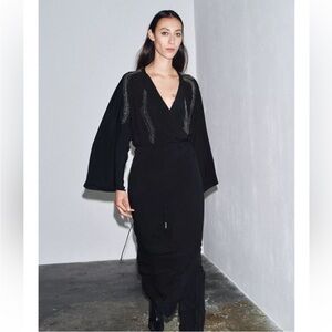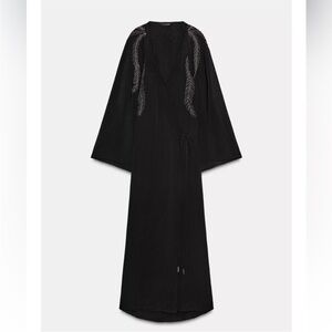 Matching adjustable tie belt. Embroidered detail with beaded appliqué. Straight hem.