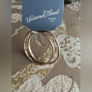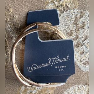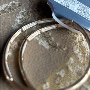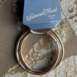 Two gold stretch bangle bracelets with a stacked design. Elastic stretch bands covered by metallic gold tubes. Easy pull on for all sizes. Enhances any look effortlessly.