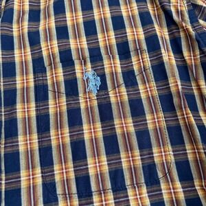 US Polo Button Down Long Sleeve Shirt Large Blue Brown Plaid Collar Pocket Cotton