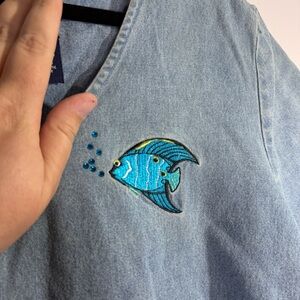 Super cute chambray shift dress from CB Casual Plus with embroidered tropical fish and rhinestone bubble details. Lightweight 100% cotton with front pockets and easy relaxed fit, perfect for beach, vacation, summer, or casual everyday wear. New with tags.