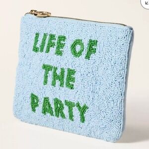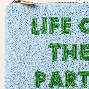 Hand-beaded exterior showcases a playful "Life of the Party" slogan in vibrant green against a soft light blue background. This slim zip-top pouch features a signature spade-logo gold-tone zipper pull and a lined interior with three convenient card slots. Perfect as a standalone clutch for events or a whimsical organizer inside a larger tote.