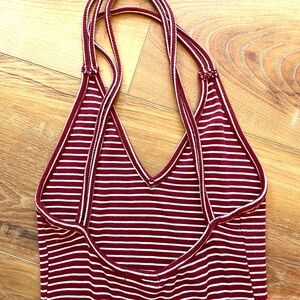 Stylish maroon and white striped t shirt dress. Perfect for casual wear. Cross straps.