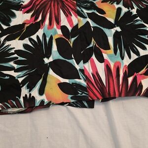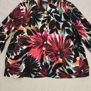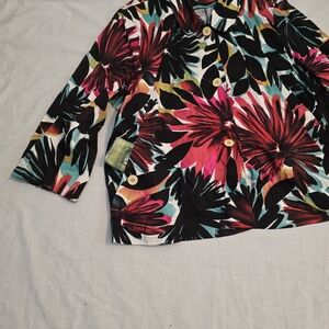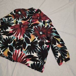 Vibrant Erin blouse with a bold pattern. Features shades of pink, black, and teal.