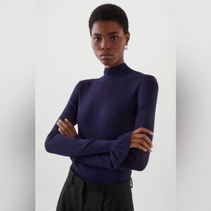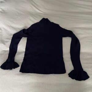 Elegant deep blue sweater with unique cuff design. Perfect for any occasion.
