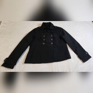 Stylish black pea coat with double-breasted design. Ideal for a polished look. See pictures for measurements. EUC. Size Medium.