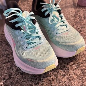 I wore these once outside to see how it felt to run in them and my toes went numb and didn’t return them in time. They are a women’s 7.5 wide Hoka Bondi 9 shoes. I would say they do not have a wide toe box, if you need that. They are in excellent condition, but I also don’t have the box.