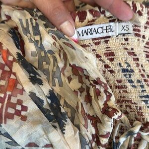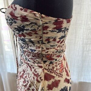 Embrace a bohemian vibe with this strapless midi dress, featuring a vibrant mix of red, blue, and cream patterns. Perfect for any occasion.
