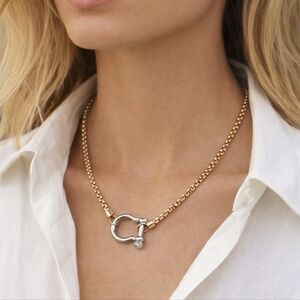 Brand new equestrian-inspired horsebit chain necklace featuring a bold stainless steel metal design with a gold tone chain and a silver tone shackle clasp. A timeless luxury style inspired by iconic Gucci horsebit jewelry and classic Ralph Lauren equestrian fashion.